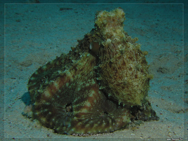 Polip korallonReef octopus. Egy koralltömbbe somfordált, amikor kiszúrtuk. Pechjére a tömböt lakó halak nem vették jónéven a beköltözését, addig csipkedték amíg kikúszott a nyílt fenékre, majd rátelepedett egy korallra. Onnantól ő úgy vette, hogy nem látom hiszen ő egy korall.