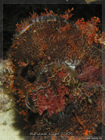 SkorpióhalCanon PowerShot S70 f 8 1/250 sec Smallscale scorpionfish. Ez a példány megközelítőleg 50-60cm-es volt, egy koralltömb tövében ferdén bújt meg, először azt hittem egy döglött sügér. Sajnos új bebújt, hogy csak fentről-ferdén lehetett fotózni, de a mérete miatt legalább részletesen látható a mintája. Életemben nem láttam még ekkora kapitális példányt.