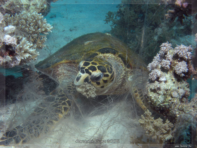 Teknős ebédSha´ab El Erg vagyis a Dolphin House zátonyon találtuk ezt a tekit. 20 percet néztük, fotóztuk, videóztuk ahogy ebédelt, végül békénhagytuk.