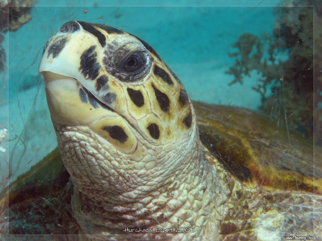 Teknős portréSha´ab El Erg vagyis a Dolphin House zátonyon találtuk ezt a tekit. 20 percet néztük, fotóztuk, videóztuk ahogy ebédelt, végül békénhagytuk.