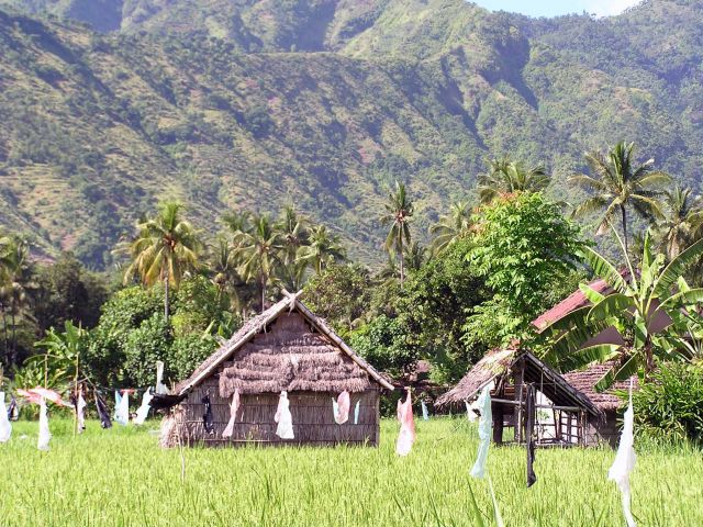 Jellegzetes balinéz táj az újrahasznosítás szép példájával. Neylon szatyrokat felfűznek madárijesztőnek és ott lebeg a madzagokon.