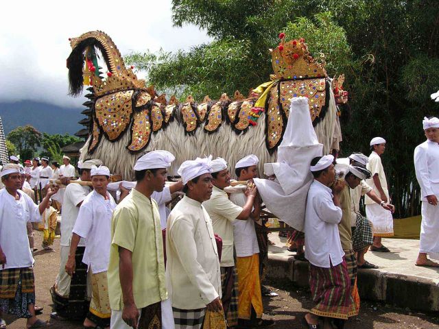 A templomi ceremónián sok ehhez hasonló gazdagon díszített szörnyet és szellemet, hindu istenszobrokat vittek körbe