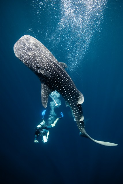 Swimming with gentle giantsCanon EOS 5D Mark II f/9 1/200 sec Diver and Whaleshark, West Papua