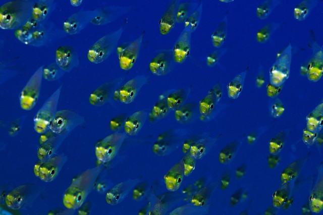 StaresNikon NIKON D300 f/18 1/125 sec In this picture we can see a shoal of glassfish, Parapriacanthus ransonneti, some two thousand strong staring at me. It is quite unusual to find them in the blue, but possible when you are diving at the Sinker in Nuweiba, Red Sea, Egypt.