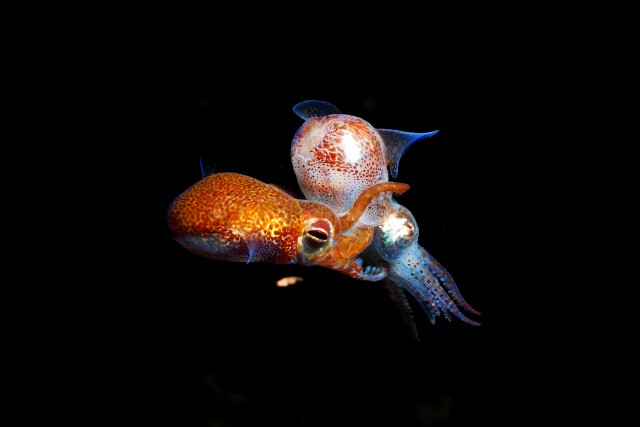Bobtails couplingNikon NIKON D50 f/16 1/125 sec Photograph taken during a night dive at a depth of about 18 meters. The subjects, about 2 cm large, swam about 0.5 meters from the bottom. Initially I thought that one devouring the other. When I got home and download the pictures to the computer I saw that they were mating.