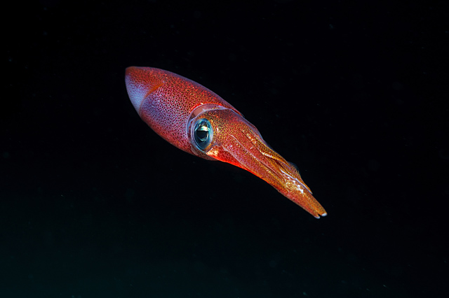 Squid in the nightNikon NIKON D50 f/11 1/125 sec A very fast squid escape in the night of the Mediterranean sea.