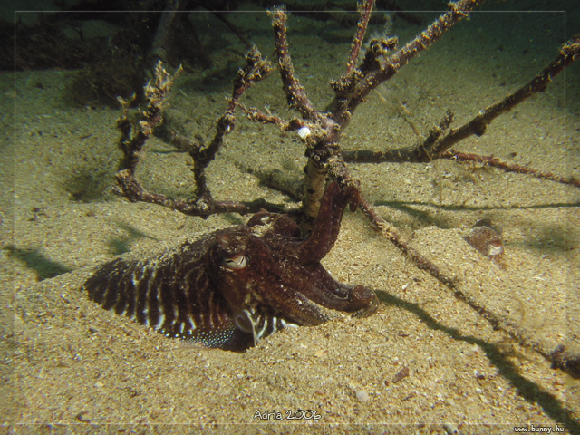 Szépia vagy tintahalSekény, homokos talajon egy vihar által befújt faág alatt dekkolt két tintahal. Mintha árnyékban heverésztek volna a déli napsütésben.