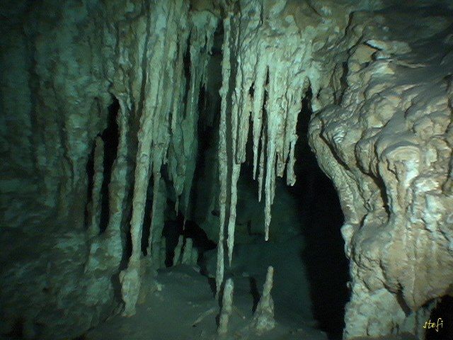 Dos Ojos - Cseppkőbarlang a víz alatt 1Csodálatos alakzatokban gyönyörködve merültük meg a barlang mindkét járatát. Furcsa érzés volt, hogy a cseppkő oszlopok - tornyok közt, lebegve kell megtenni az utat, nem pedig a világ más helyein már megszokott kisvasút visz be a termekbe.