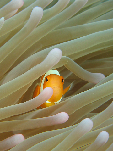 Bali, indonézia. Tulamben partjainál lakik ez a kis bohóchal szüleivel egy csendes anemónában. Feltöltő: Bunny , Megtekintve: 1737