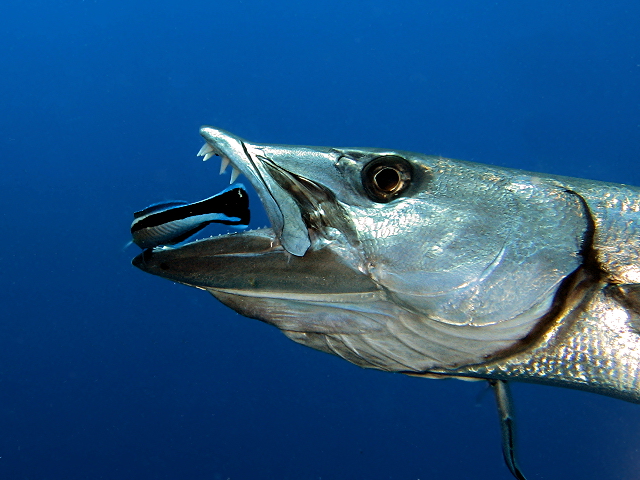 Takarítóhal: "Remélem túl van már a reggelin ez a félelmetes fogsorral rendelkező páciens?" Barrakuda: "Remélem nem engem akar reggelire ez a villogó micsodával rendelkező, zajos idegen?" Fotós: "Remélem nem azért engedett ilyen közel magához ez a nagy barrakuda, mert belőlem szeretne reggelire?" Jelentem mindenki épségben túlélte a találkozást... :) Feltöltő: nme , Megtekintve: 1744