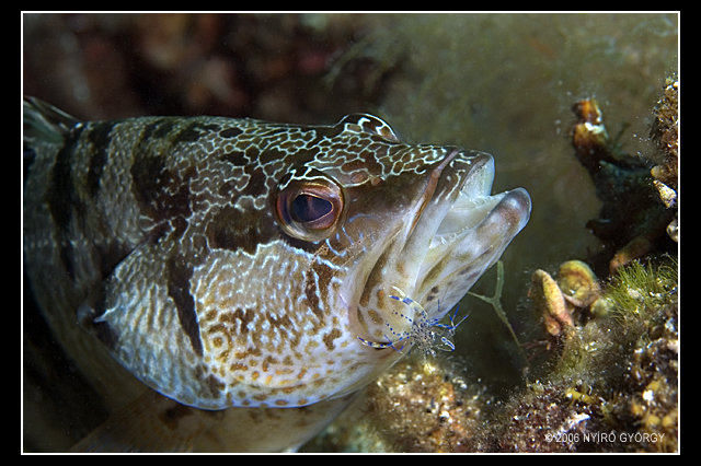Betűsügér tisztogató állomásonNIKON D70 f 9 1/100 sec Cres-sziget. Merülés utolsó perceiben sikerűlt elkapni a pillanatot. Talán három képet tudtam készíteni, mert közeledvén a halhoz máris megrázta magát és elillant. Muszály volt 20% kropp, hogy a téma konkrétabb legyen.