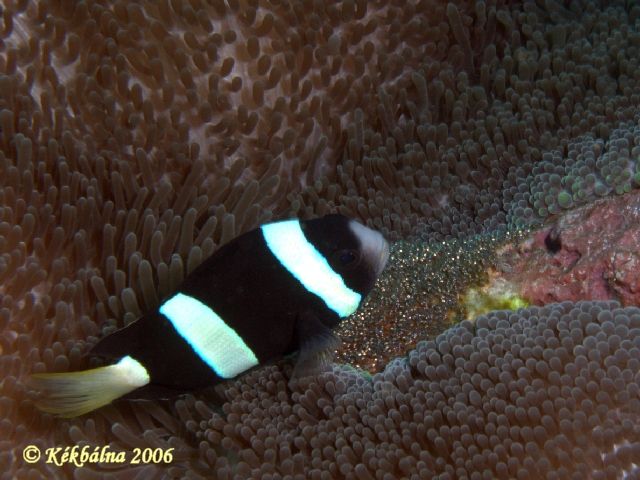 GondoskodásRokonaival a maldívon találkoztam itt is élnek egy pára. Ez a példány a roncson lakik és anyai örömök elé néz. Vagy már túl is van rajta? Tudja a fene ezek a peték minek számítanak? A kis harcias bőszen őrizte a fészket. Legyezgette, babusgatta. Megnézném mikor a hal oviba viszi ezt a pár száz porontyot. :)