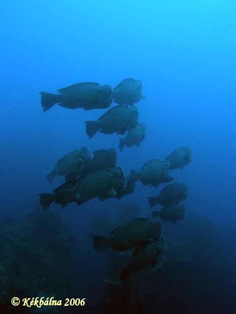 Bumphead papagájhal csordaEsetükben ugyanis hiba lenne rajról beszélni. Huszon egynéhányan vannak és a roncsban alszanak. Ja és szerintem a méter feletti halak nem rajban, hanem csordában járnak. Legalább is reggel. Aztán mindenki szétszéled "legelni".