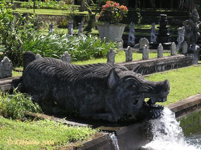 Király fürdő - Vízet köpő disznóHát igen. Nagyok ezek a medencék. Ezért pár combosabb betápláló csatornát is be kellett tenni valami állatba. Bali hindu sziget, a disznó ezért pont jó erre a célra. Elég nagy és dőlhet a szájából a víz.