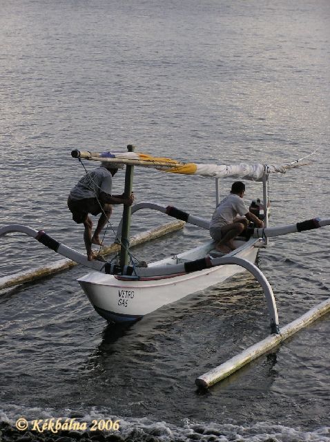HalászokA helyi halász "flotta" által használt csónakok nagyon keskenyek. Ez viszont nem akadályozza meg a halászokat abban, hogy kalandvágyó búvárokat fuvarozzanak az öblön túlra. Mit mondjak az utazás hagyján. De a ki-/beszállás annál sportosabb. Na ja ez extrém sport. Ennyire?