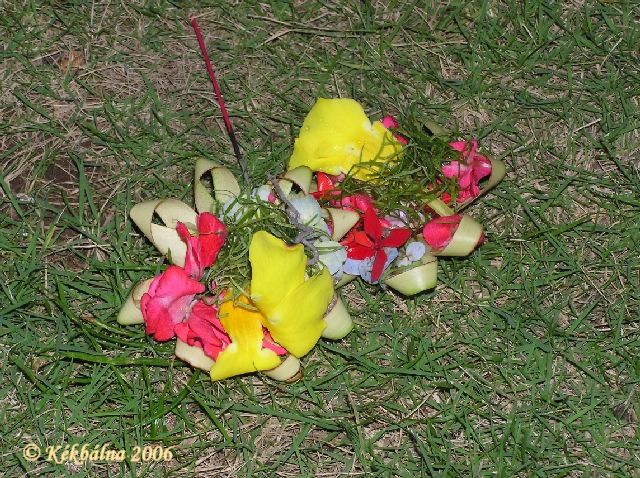 Áldozati tálkákBali az istenek szigete. Minden alkonyatkor hölgyek járják körbe a fontos helyeket és ehhez hasonló áldozati kosárkákat helyeznek el ott. Ez például a föld gonosz szellemeinek ajándéka. Útkereszteződésekbe és kapukba helyezik el azért, hogy ne jöjjenek be a házba.