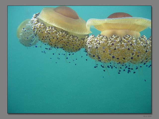 szemölcsös medúzákZirje külsôrôl visszafelé betértünk egy kis öbölbe, ahol egy szép nagy csapat ilyen srác sodródott éppen. Fenséges látványt nyújtottak, ilyen állat tényleg nincs. Gépet azonnal a vízbe és kattintani, kattintani...