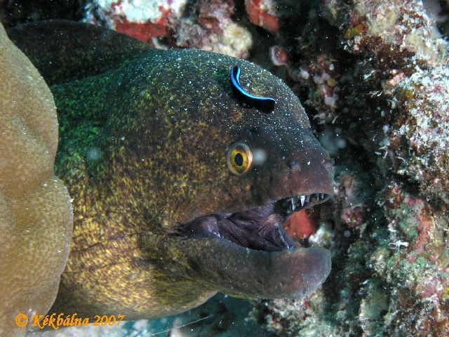 Fogmosás muréna módoraEz a kis inci-finci halacska ki-bejárt a muréna szájából ezen a tisztító állomáson. Így van ez ha az embernek nincs szuper zselépárnás, gömbcsuklós, ínybarát fogkeféje.