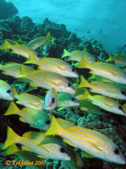 Sárga csattogó halrajVolt egy kis áramlás ezért a raj szépen egy árnyékos helyen beállt vele szemben. Elég jól viselték jelenlétem. Bár az egyikük mindig rajtam tartotta a két szemét. :)