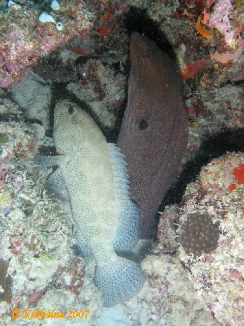 Kutya macska barátságAz úgy volt, hogy a sügért fotóztam. Aki egy picit betojt tőlem mikor a haverját - szintén sügér - kezdtem fotózni és így egy kicsit felé ereszkedtem. Fel is vette a nyúlhal cipőt, iszkiri irány az alattam lévő barlang. A fotózást befejezve én is benéztem az üregbe. Hát nem ráfaragott a kis huncut. Bent ugyanis egy nagy muréna várta a sorát a "mosóban". Na ezek ketten kijönni nem mertek. (Miért?) Bent meg egymástól paráztak, izzadt a víz mikor lefotóztam őket.