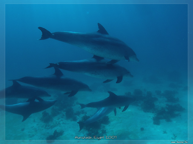 DelfinekSha´ab El Erg megbízható delfines hely, kár hogy csak átúsznak általábban a búvárokon, ritka amikor megállnak kicsit játszani, és mivel a víz kissé opálos volt az ember már csak azt veszi észre, hopp, elúszott mellette egy delfin falka. Fotózni ezért nem jó, de az élmény ...