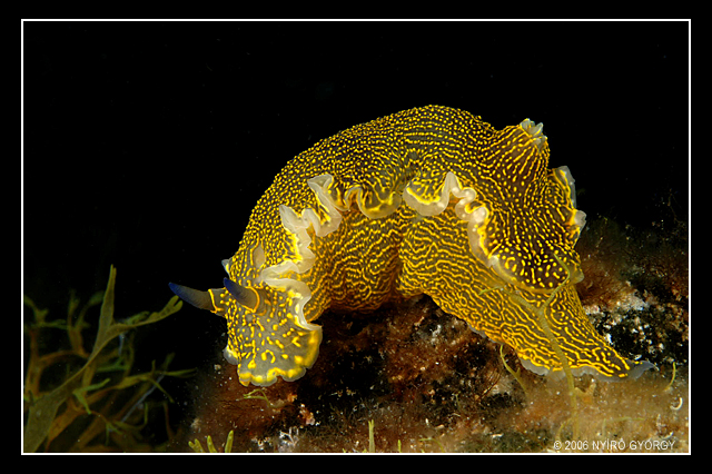SárgaságNIKON D80 f 22 1/60 sec Utolsó merülésünk utolsó perceiből. Pont találtam - végre- egy nyálkás halat amikor méterekre tőlem Pisti eszeveszett módon nekiáll fotózni. Kíváncsiságom csak nem hagyott nyugodni, odamentem. Ez a kb 6-8cm-es csillag-csiga díszelget István gépe előtt. Alapos munkája után átadta a terepet nekem is. Köszönet érte!