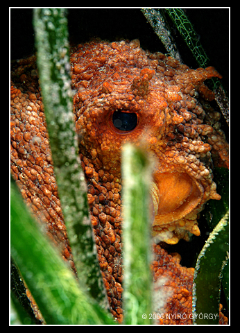 MegbújvaNIKON D80 f 13 1/60 sec Másik kép a már említett polipról de a 10 perc után mégis csak beásta magát inkább a zöldbe. Óvatosan azért utána lopóztam...