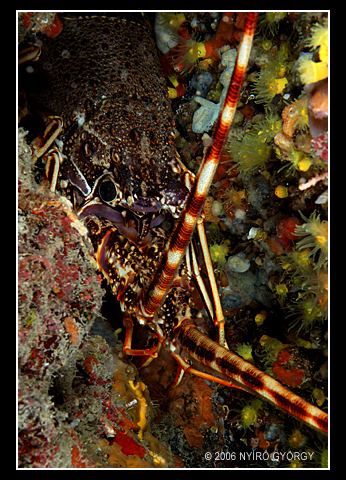 Languszta hasadékábanNIKON D80 f 19 1/60 sec Merülésünk egyik célja. Mélység kb 37m, a hőfok igencsak 12C. Egy hasadékban találta meg csapatunk és rögtön vagy 5 fotós vette kezelésbe. Az általam készített két képből az egyik.