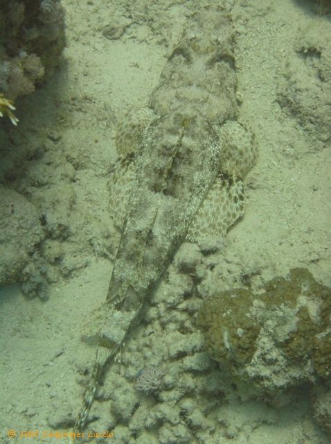 Ez a krokodil hal két szikla között lapult a fenéken. Teljesen nyugodtan simult a homokos fenékhez. Nem alaptalanul, jó a mimikrije.
