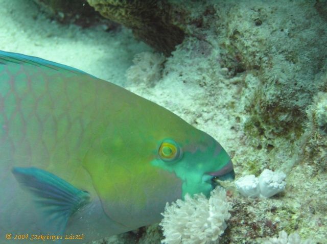Sikerült megörökíteni egy papagájhal ebédjét. Ez a szép nagy példány jóízűen ropogtatja a korallokat a bennük lakó polipokért.