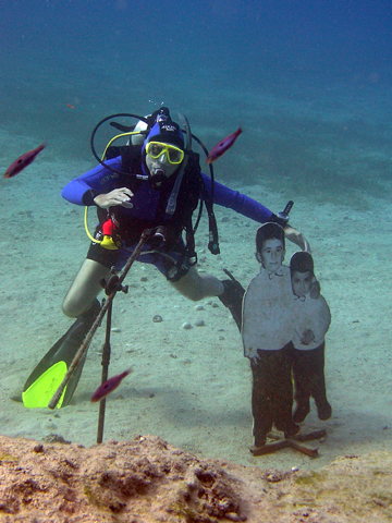 Vízalatti táncdal fesztiválOLYMPUS C750UZ f 2.8 1/100 sec Egyik barátom a vízalatt talált mikrofon és a lábon álló gyerek paranávok láttán dalra fakadt, mikor a törökországi Kasban meglátogattuk a vízalatti tárlatot. Temészetesen az "Én és a kisöcsé(i)m" slágert dúdolta a reduktorba, miközben lágyan ringatózott a mikrofon mögött. Hát nem idilli? :)