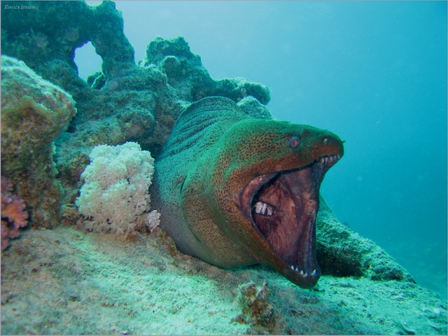 búvárvezető rendszeresen etette virslivel a muréna pajtit. az meg rászokott, hogy csak ezt eszi, egyszer a zacsival bénázot a gyerek, a muréna meg éhes volt. mivel nem túl jól lát a csávóka hüvelykujját hamizta be. kicsit megrázta magát, és tőböl tépte le a srác ujját. nem is lett meg. a jobb lába középső ujját tették oda neki az ügyes orvosok. érez vele, meg tud fogni, de nem túl vonzó. nem házállat az biztos | ||