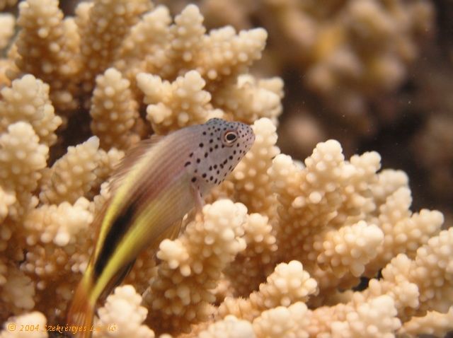 Otthon, határozás közben jöttem rá, hogy ez egy korall őrhal. Az ő rokona a hosszú orrú korall őrhal, amit mindig piros lágy korall előtt fotóznak.