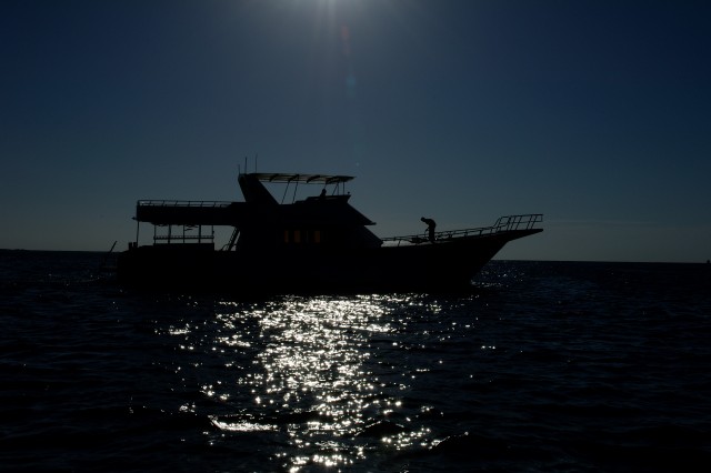 Egyiptomi mélydéli safari kép a St. John's szigeteknél. Egyik reggel erre a látványra ébredtünk. Az a nagyobb hajó éppen süllyed, aznap éjjel futott zátonyra. A búvárokat és a személyzetet már kimentették, a kis hajó éppen a motyót szedi ki belőle. Kicsit kivártunk a helyszínen, mert felmerült egy friss roncs merülés lehetősége :), de aztán letettünk róla, mert nagyon lassan süllyedt és alatta 35 méteren volt volt egy 20-30 méteres padka, kicsi volt az esélye, hogy éppen ott akad meg. Az összes többi esély ahova eshet az nagyon mély kék színű volt, úgyhogy passzoltuk a wreck dive-ot.