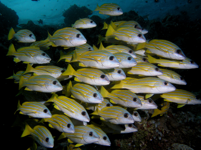 Még sárga halacskákOLYMPUS C8080WZ f 8 1/800 sec Fihalhohi house reef-jén egy nagy makléra raj mellett ezek a sárga csattogóhalak is laknak. Sokat birkóztam mindkét témával. Nekem ezt tetszett legjobban.