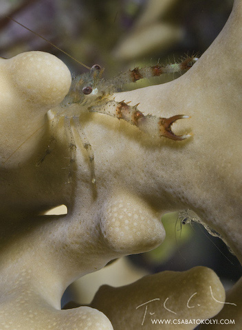 LesbenNIKON D200 f 32 1/250 sec Kis Galathea rak varja a fopincert egy korallon. Elso alkalommal talalkoztam veluk, es nagyon sokat lottem rajuk. No persze mindig masikra, mert amint villant a vaku, az aktualis egyed helyzetet valtott v elillant. Olyan fel centisek lehettek melyekkel talalkoztam. Sokan voltak. A kep bal also reszen a korall masik oldalan piheno garnela a raadas.