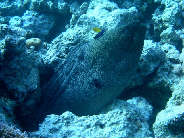 Óriás muréna kis halakkalOLYMPUS C5060WZ f 3.5 1/60 sec szerettem volna valamelyik kísérő búvárt mellé küldeni, hogy jobban látszódjanak az arányok, de a riadt arcokra nézve meg sem próbáltam elmutogatni, hogy ússzon közelebb valaki... :-)