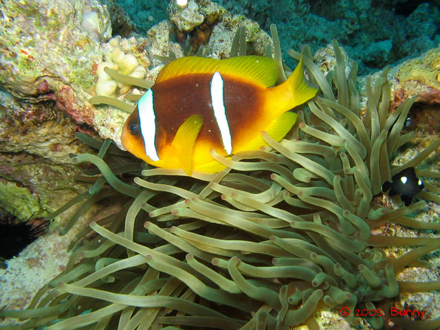 BohóchalakCanon PowerShot A60 f 7.1 1/125 sec A kép érdekessége a pici fekete fehér foltos bohóchal a sarokban.