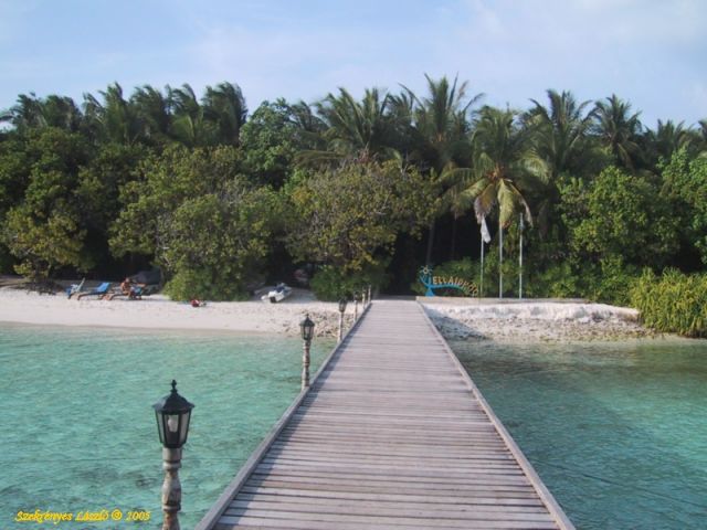 A sziget bejárataMegérkezve a szigetre a mólóról ez az út vezet a sziget belsejébe. A house reef 30 méteres sötét kék mélységétől a lagúna türkizén át vezet az út fehér homokra. Pazar.