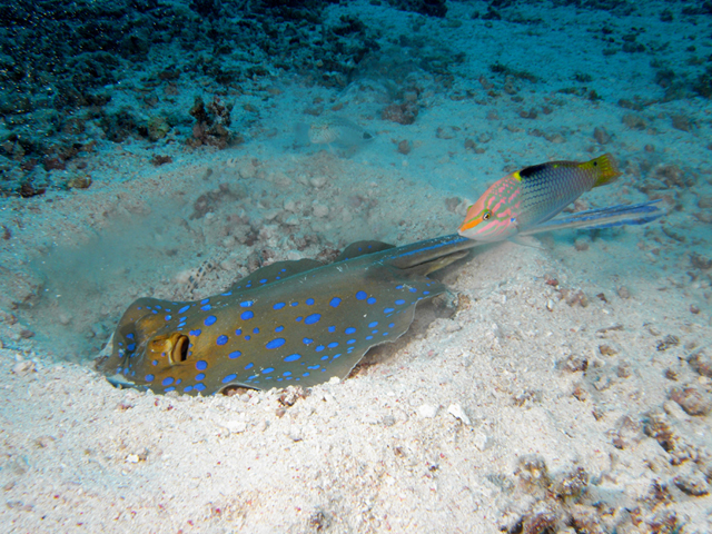 Kék pöttyös rájaDSC_Maker DSC f 8.2 1/100 sec A papagájhal beúszott a képbe és ezzel beszavazta a képet a képtárba. Helyesek együtt.