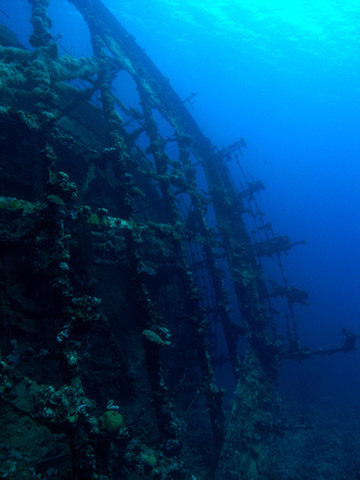 Az Umbria tatjaDSC_Maker DSC f 3.6 1/380 sec A tatot valamikor fa borította. Persze a vízalatt a fa gyorsan elkorhadt. Maradt a fém váz és alatta a hatalmas kerék, ami a kormánymű része.