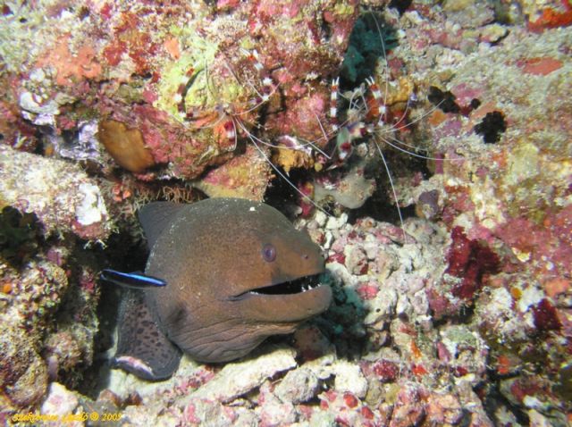 Egy full extrás tisztítóállomásAz egyik thilán emelkedés közben vettem észre ezt a morcos murénát. Termetre közepes volt és idegesnek tűnt. Jobban megnézve jöttem rá, hogy tisztálkodás közben zavartam meg. A kék kis halacska illetve a rákok takarították, amíg be nem úsztam.