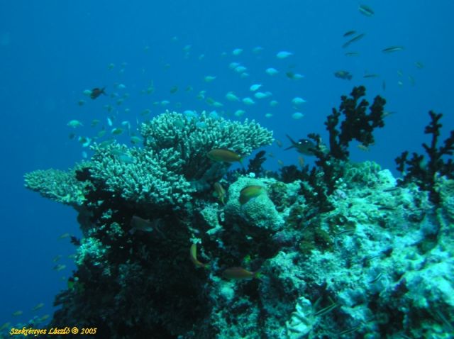 Egy reef csúcsaA kék halacskák a kőkorall ágai között élnek. Ha baj van oda húzódnak vissza. Mikor nyugodtak nyüzsgő kék felhőként veszik körbe a korallt. Egyszerűen gyöngyörűek. :)
