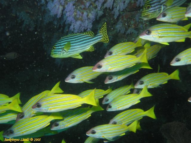 Kék csíkos csattogó halak a lágykorralos ürgekbenA nagyobb üregekben nem csak a lágykorallos menyezetben lehetett gyöngyörködni, hanem a bent lazító halrajokban is. Itt például édesajkú és csattogó halak raja úszott az üregben.