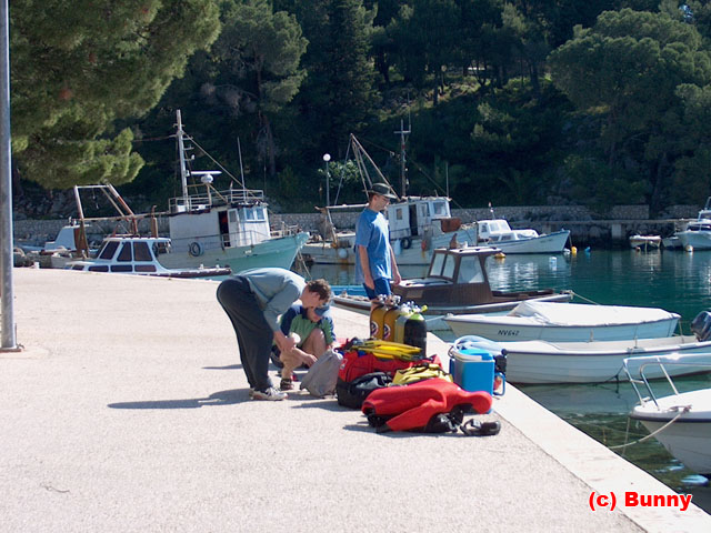 Mandre kikötő - bepakolásHewlett-Packard HP PhotoSmart 618 (V1.10) f 3.6 1826/1000000 sec Igazi minőségi ugrást Anté a mandrei magyar származású barátunk hozta, az apró Lastavica nevü hajójával már nem csak partról tudtunk merülni, hanem távolabbi térségeket is fel tudtunk fedezni. Hajózási térkép segítségével próbáltunk szép falakat keresni, és ott merülni - hja, a régi szép idők, amikor mindenki önállóan ott merült ahol akart.