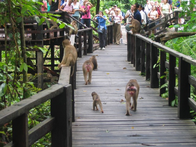BandaCanon PowerShot A95 f 4.5 1/50 sec Majomcsapat üget a turisták felé némi adomány reményében a Sepilok Orangutan Centerben.