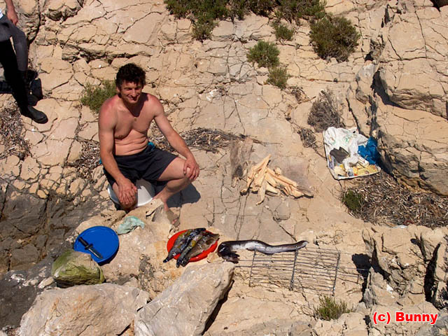Ebédhez készülünkHewlett-Packard HP PhotoSmart 618 (V1.10) f 11.9 3275/1000000 sec Még mindig Pohlib, Anté előtt az ebédre lőtt halak, tüzifát a szigetre kisodort törmelékekből gyűjtöttünk, a többi felszerelést hoztuk magunkkal.