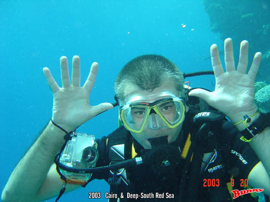 sportemberSONY DSC-P10 f 2.8 1/250 sec A búvárkodás komoly sport, kicsit már untam, hogy Gábor fotóz, és szamárfület mutattam neki. Véletlen ez lett a legjobb arcképem a víz alatt :)