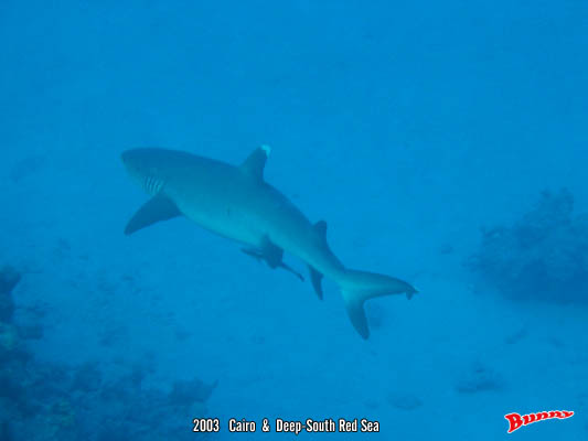 fehéruszonyvégű szirticápaCanon PowerShot A60 f 4.8 1/60 sec Igazából delfinekre vártam a Dolphin house zátonynál sznorival lebegve (készülékkel bemenni tilos) a kora reggeli órákban, amikor mejelent alattam a cápa. Én meg persze - ellentétbe a filmeken látottakkal - megörültem, sőt menekülés helyett üldözőbe vettem, és le-lebukva próbáltam lekapni.