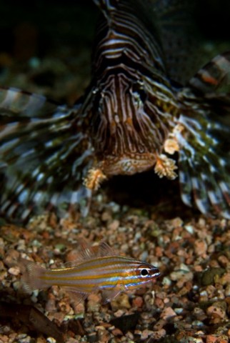 In memoriam "kis hal"Fgép: Nikon D200 rekesz: 22 zárseb.: 1/200 sec A felvétel most novemberben készült Dahabban, Divefoto vette észre amint a tűzhal éppen vadászik,én meg a jobb pozícióban voltam.:-) Sajnos 2-3 felvétel után a kis hal sorsa megpecsételődött, így most már csak emlékeinkben él! (mint Enver Hodzsa az Albán nép megmentője)